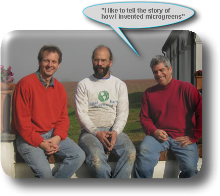 The photo below is of Luca, Mike, and Craig at the Vineyard the morning after a Fabulous Truffle Dinner on the site where nanogreens were first served. Chef Craig Hartman, shown here on the right, loves to tell his "microgreens" story when he introduces a special culinary event. In the early nineties while at the Clifton Inn, Craig asked Mike to cut some smaller lettuces, and still smaller, till one day Mike came into the kitchen during a culinary book interview and photo shoot with the tiniest greens yet. We called them microgreens, charged him a bundle - because we cut half our total production just to get the one box - and the name got printed! We can't really verify that it was the first time such a term was coined; however, we do know that nanogreens were invented right here at Palladio where this photo was taken. Hartman is an annual guest Chef at Palladio serving incredible multi-course meals with paired wines from Barboursville Vineyard. During one of those special dinners we delivered the tiniest greens we ever cut and as a little joke we had labels printed as "Nanogreens Special cut for Chef Hartman dinner". Well, they were a big hit and now Palladio gets a delivery of nanogreens each week! Mike was an engineer and he couldn't resist going from the term micro (the abreviation for 10 to the negative 6 exponent) to the term nano (10 to the negative 9 exponent). He is trying for pico ( that would be 10 to the negative 12 exponent ) - but those greens are really just what we all know as sprouts.